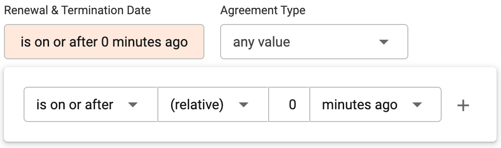 To see renewals and terminations after or before a certain date, set the necessary parameters by choosing the filter and using the drop-down to set the parameters.