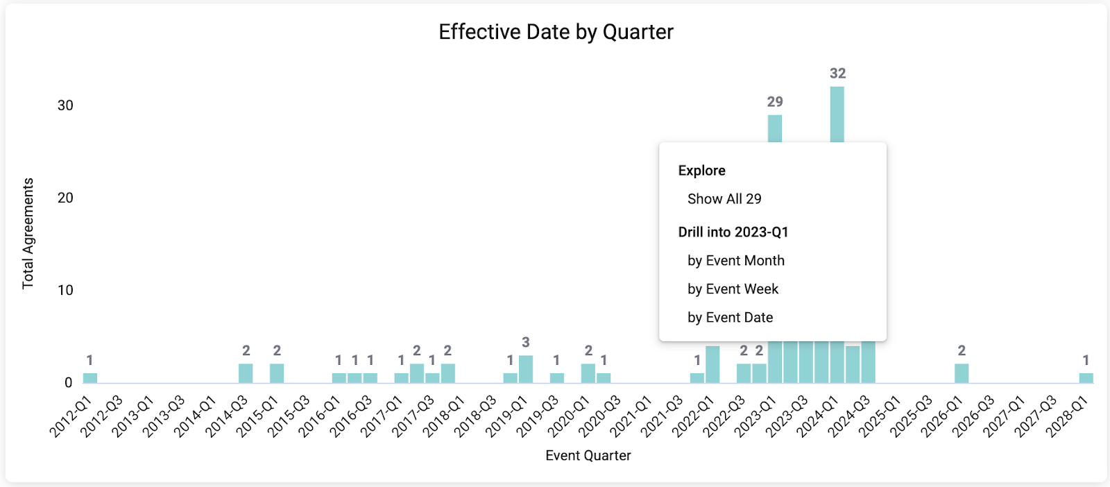 - Effective Date by Quarter: Bar chart of how many agreements start each quarter.