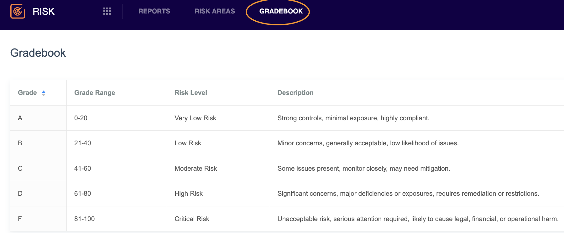The Risk Scoring Gradebook provides a reference for how numerical risk scores are translated into letter grades. These grades help standardize the interpretation of risk levels across all contracts.