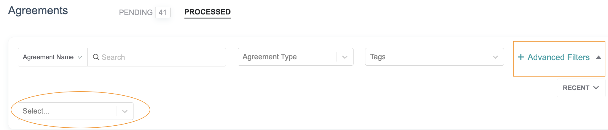 Click the + Advanced Filters button, then select the Agreement Type Term data point from the drop-down.