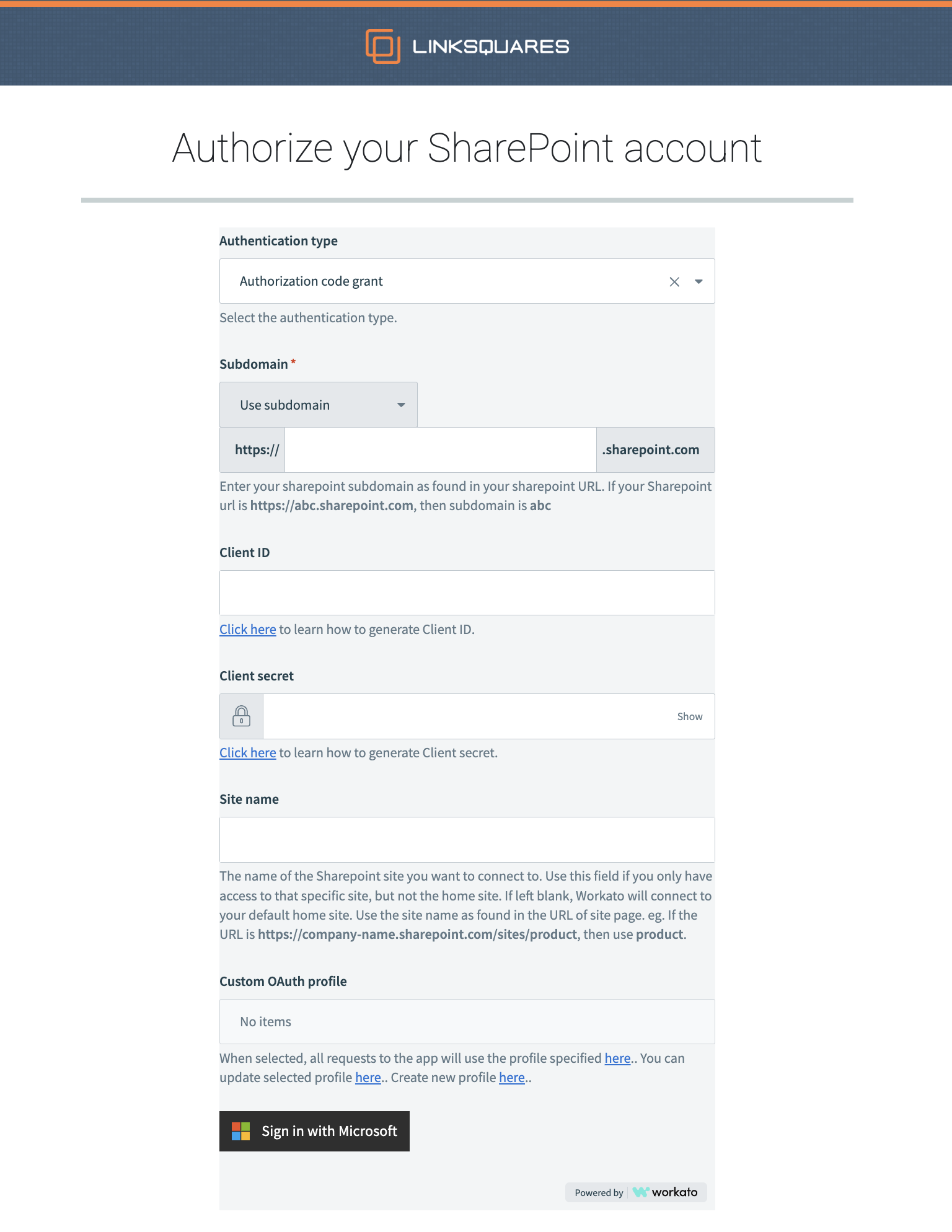 To set up your SharePoint integration, you need to register this app with your SharePoint account. To learn more about registering with your SharePoint account, reference this web page on How to connect to SharePoint on Workato.