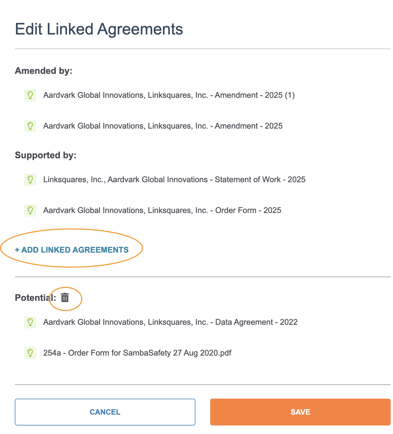 LinkAI automatically suggests agreement relationships, but users may add or remove Linked Agreements at any time.