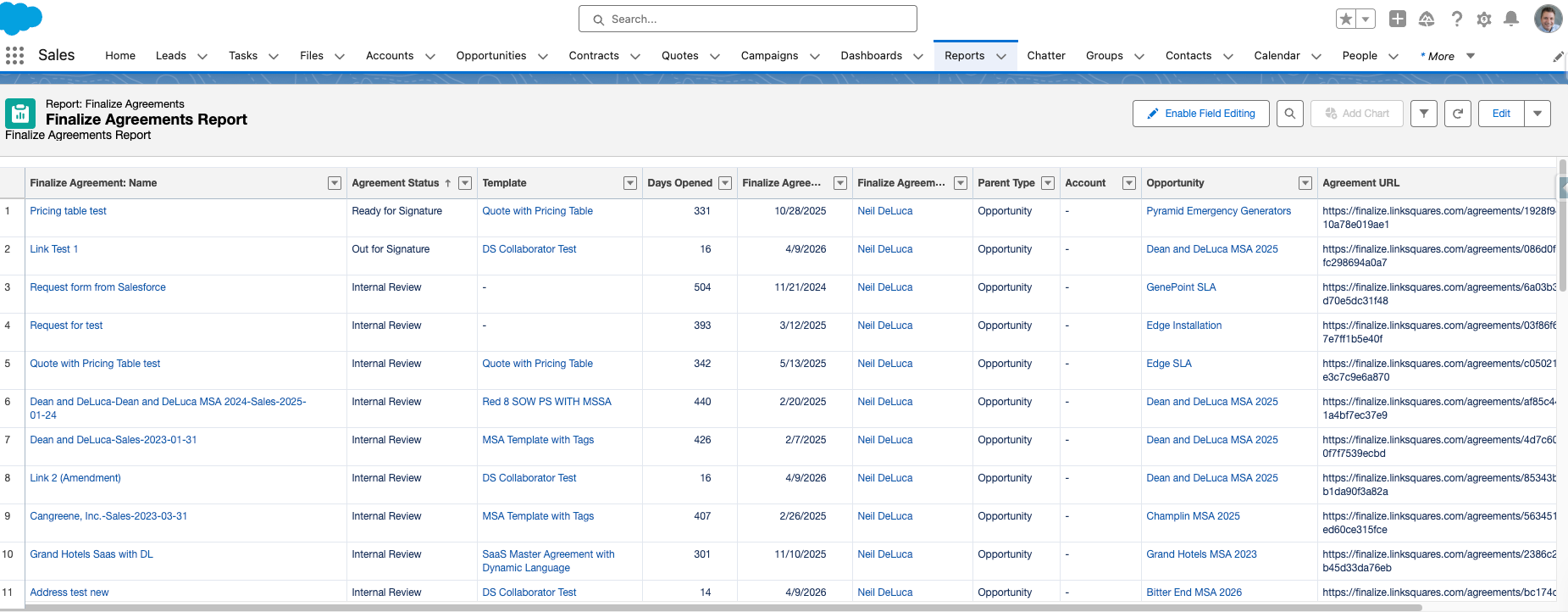 Creating a LinkSquares Finalize report in Salesforce will allow for tracking agreement statuses, owners, and key dates directly within your CRM.