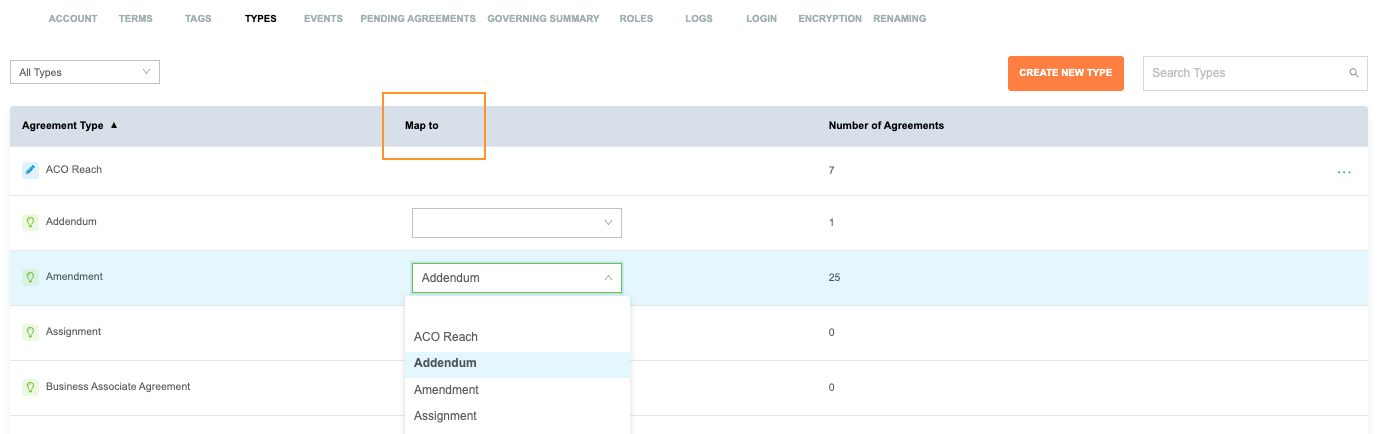 4. To map to existing agreement types, use the drop-down 'Map To' column and choose the agreement type.